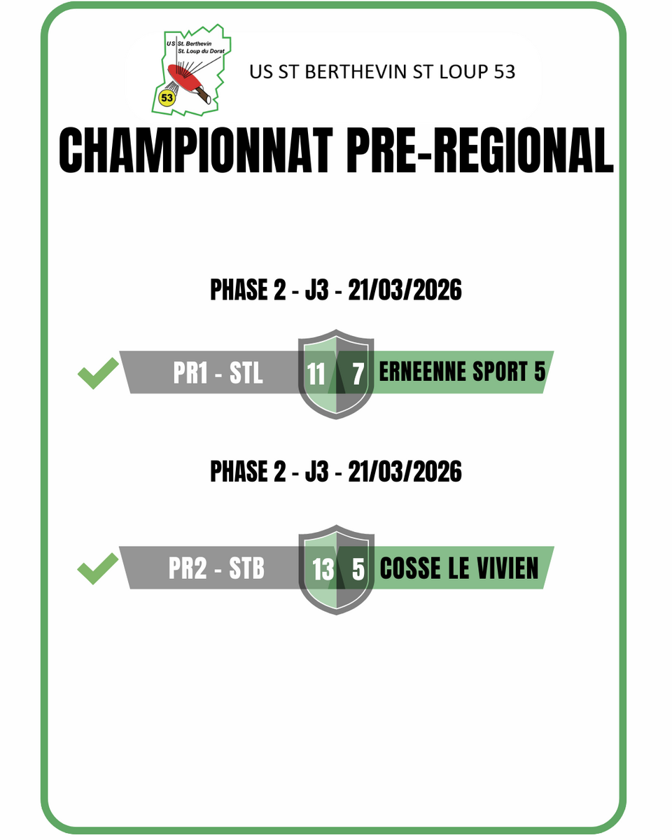 Victoire de nos deux PR Avec la PR1 qui se retrouve 2ème à égalité avec La Selle Craonnaise, et la PR2 qui se retrouve 2ème juste devant Cossé ! Une belle opération pour ces deux équipes !